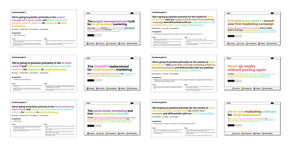 When Fletch walked us through the positioning sprint (2 weeks from start to finish), they laid out six distinct bets for where Enji could play. Seeing them side by side was genuinely helpful—and a little 😳, because it showed just how many ways you can frame the same product.